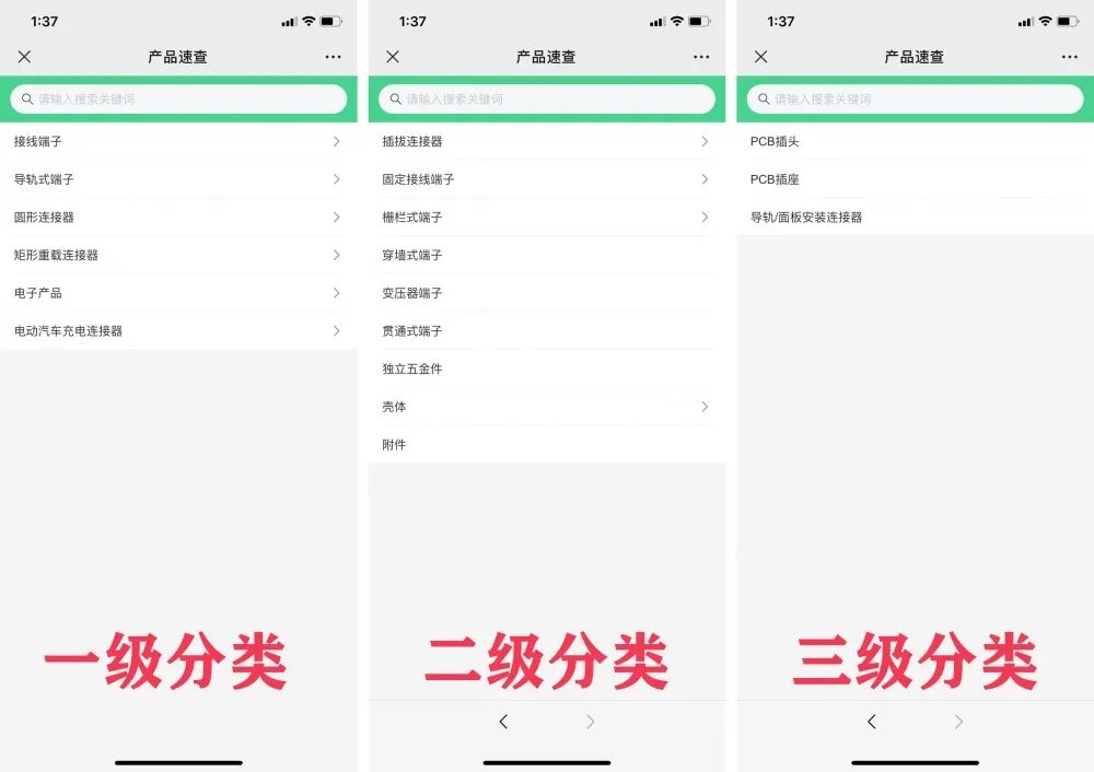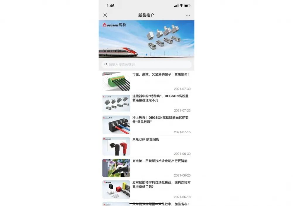 而現(xiàn)在,DEGSON高松微信公眾號全新設(shè)置了【產(chǎn)品速查】模塊,開啟全站檢索功能,多維度貼合需求。用戶可以根據(jù)DEGSON高松6大產(chǎn)品系列,分系統(tǒng)了解各個連接器;同時,也可以根據(jù)不同需求在搜索窗口輸入關(guān)鍵字,直達(dá)目標(biāo)。除了產(chǎn)品的優(yōu)勢,快捷服務(wù)可以幫助用戶360°了解產(chǎn)品,包括技術(shù)參數(shù)、認(rèn)證情況、線束、顏色等內(nèi)容,幫你快速確認(rèn)連接器是否符合需求。
